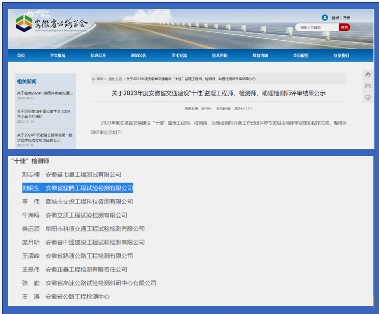 日前,从安徽省公路学会获悉,骏腾检测检测师刘银生凭借严谨的工作态度和卓越的专业技能,在行业内脱颖而出,荣获2023年度安徽省交通建设“十佳检测师”荣誉称号。