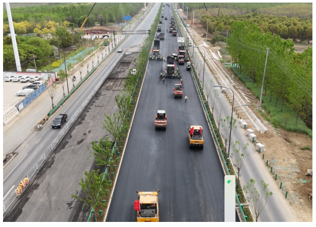 此次沥青上面层摊铺采用全断面一次摊铺工艺,摊铺机、压路机、运料车协同作业。施工前,项目部积极对接沥青拌和站,制定专项施工方案,层层进行技术交底,严格把控摊铺温度、碾压遍数等关键参数,在确保安全、质量、环保的前提下按下项目建设“快进键”。(冯晓强)