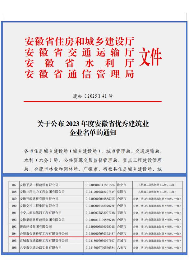 开云最新官方 > 开云最新官方 > 详细新闻近日,省住房城乡建设厅、省交通 运输厅、省水利厅、省通信管理局联合公布了2023年度安徽省优秀建筑业企业名单。经认定与公示,合肥路桥公司凭借卓越的工程质量、创新的技术实力和高度的社会责任感,荣获“安徽省优秀建筑业企业”殊荣。